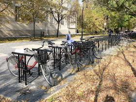 A belvárosban most már csaknem az összes fontosabb közintézménynél és szolgáltatásnál (gimnázium, Polgármesteri Hivatal, bank, stb.), templomnál, üzletsornál valamint a központi buszállomásnál leköthetjük a bicajunkat a mai követelményeknek megfelelő támaszokhoz. Nem is kevéshez, megdöbbentően sokat raktak le szerte a városközpontban. Szinte mintha Hollandiába csöppentünk volna. Ami különösen tetszik, hogy itt-ott még a parkolókat is feláldozták, hogy a helyükre kerékpártámaszokat helyezzenek.